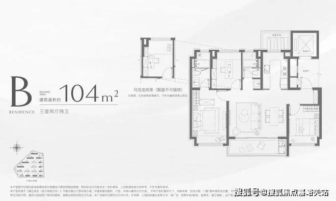 104㎡的户型,采用了大横厅 +270°转角窗设计,南向阔景阳台面宽约5.3米,这样的尺度,在100平出头的面积段极其罕见。另一个南向客卧不管是当成老人房还是客房,都与另外两房做了物理分割,保证了最大程度的舒适度和私密性。